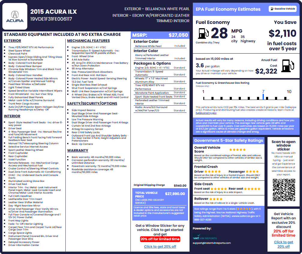 The cost to get your Acura window sticker is $25. You’ll receive the complete Monroney label instantly online with full vehicle specifications, features, MSRP, and equipment details included.