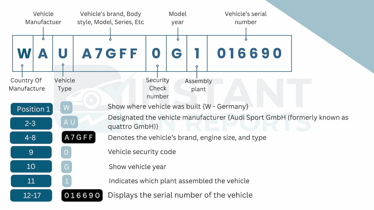 Audi VIN is a 17-character identifier that encodes maker/region (WMI), vehicle attributes (VDS), a check digit (9th), model year (10th), plant (11th), and a serial sequence (12–17). Classics may have shorter chassis numbers.