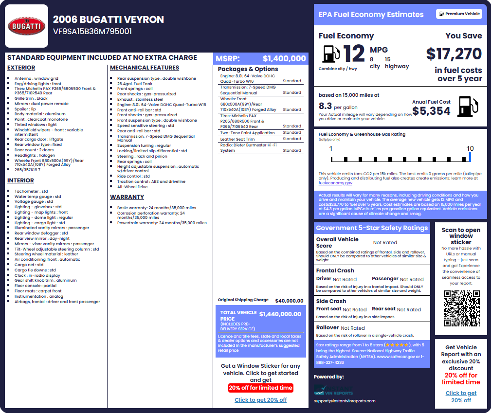 A Bugatti window sticker provides a detailed look at how the vehicle was originally built. Here is what you will typically find: