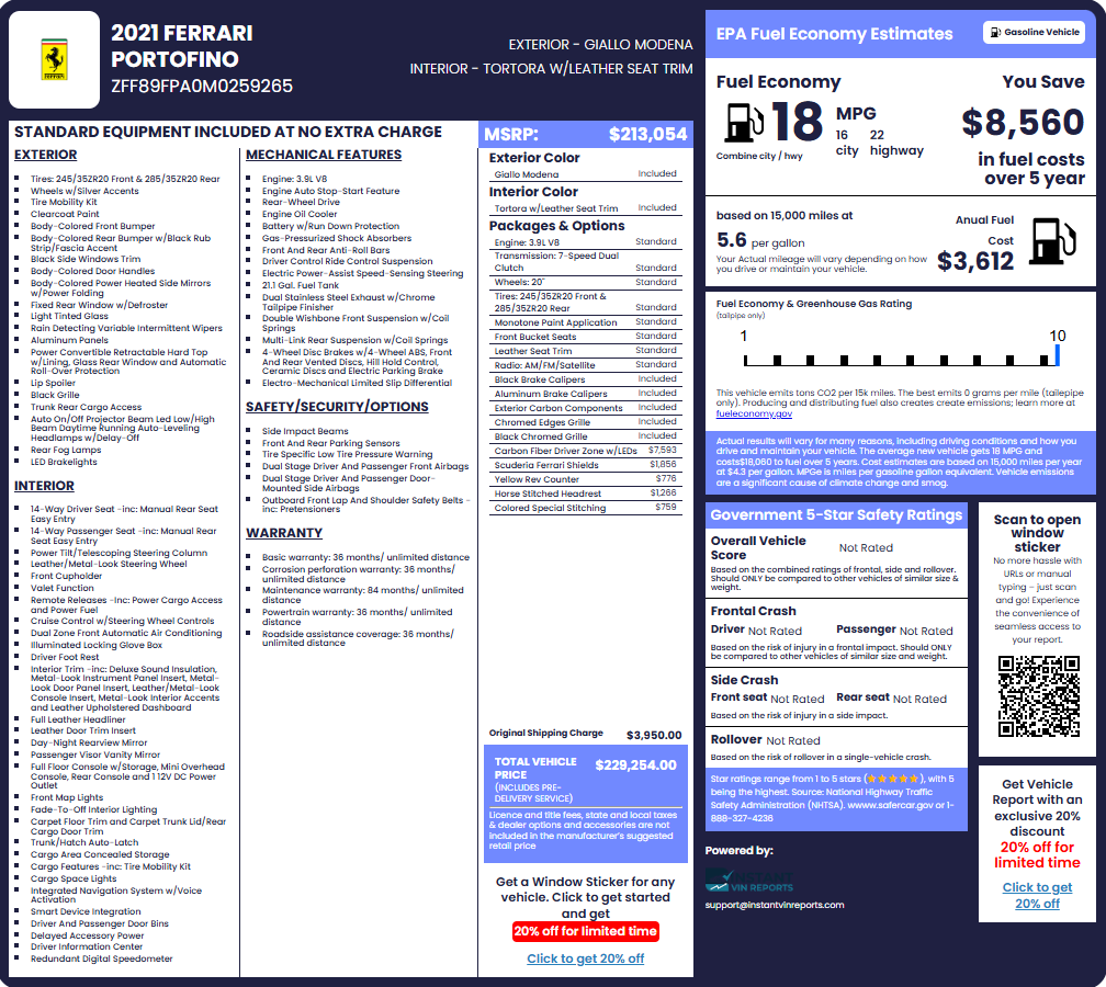 This includes the model name, trim, body type, and VIN. It’s how you confirm you’re looking at the right car. A Ferrari window sticker identifies everything from a Portofino M to a SF90 Stradale with precision.