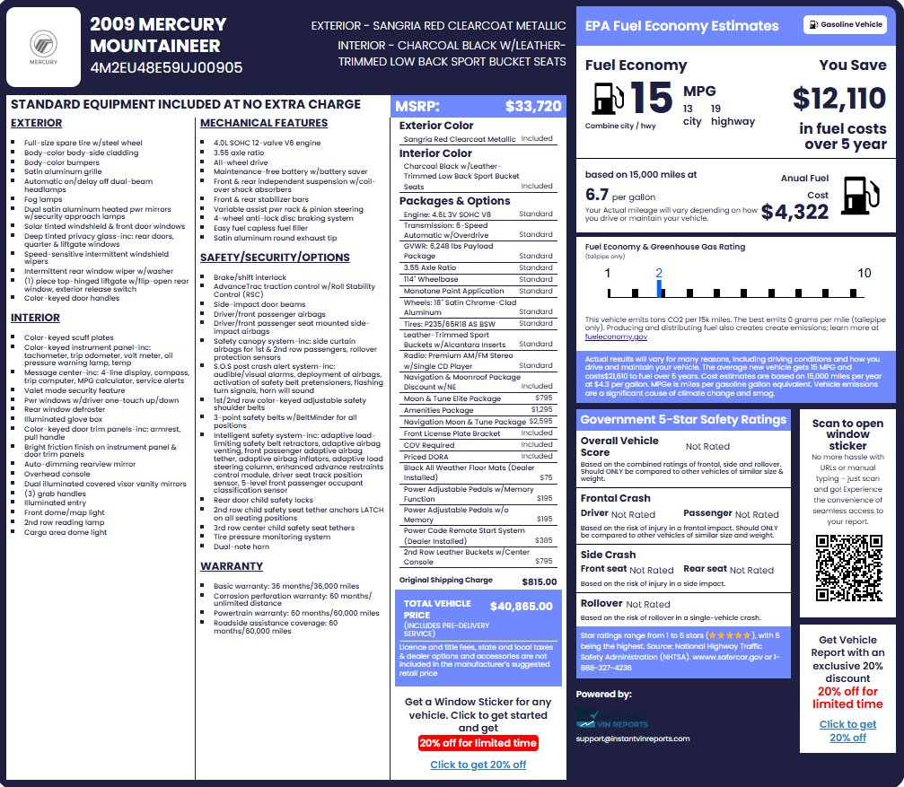 With a Mercury window sticker, you will see the original specs, colors, options, equipment, pricing, fuel economy numbers, safety ratings, and warranty details. All information is based on factory records.